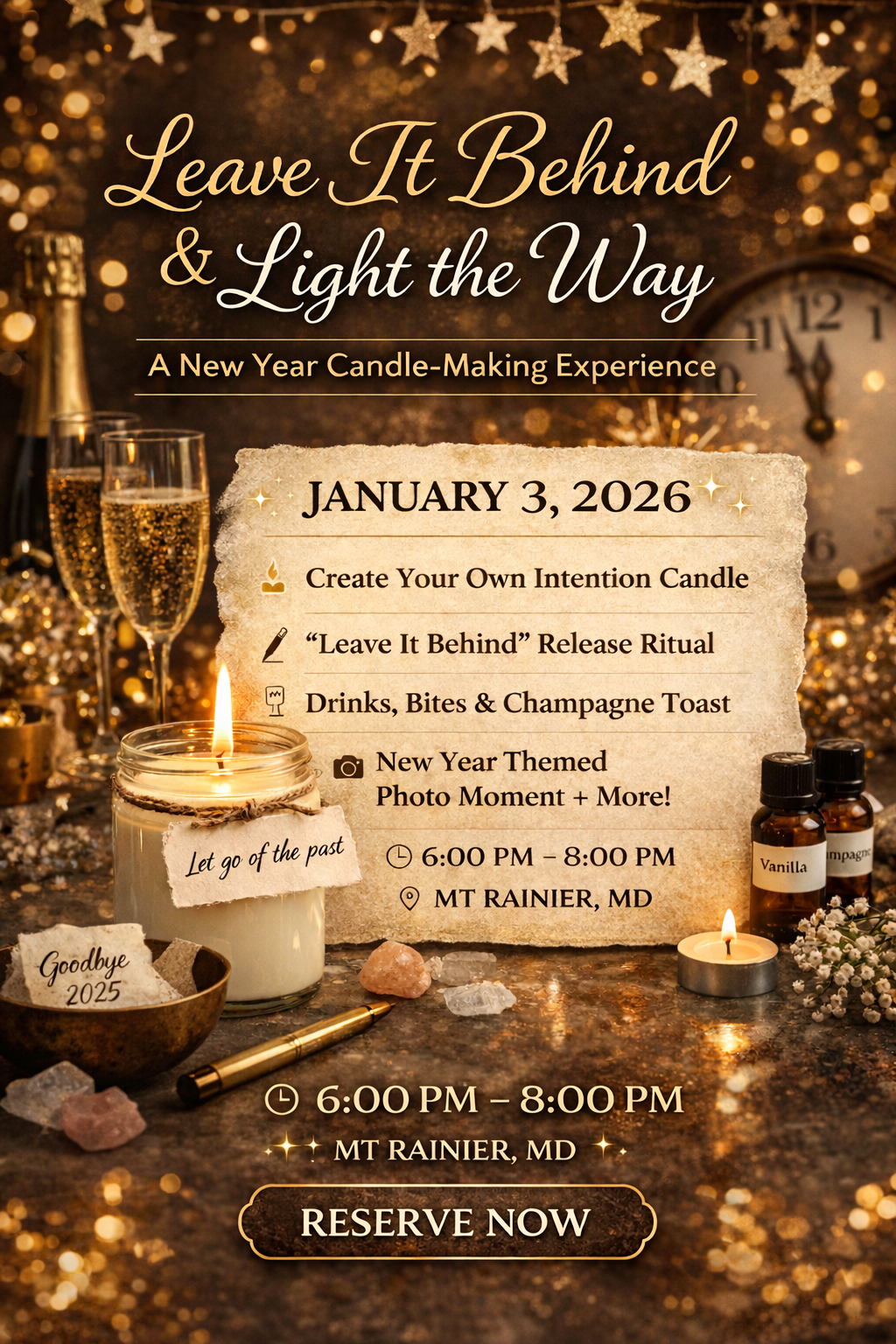 Leave It Behind & Light the Way is an adults-only candle-making workshop designed to help you release what you’re carrying and welcome the new year with purpose. Guests will create a custom-scented candle while participating in a guided “Leave It Behind” release activity—an opportunity to let go of what no longer serves you and set intentions for what’s ahead.