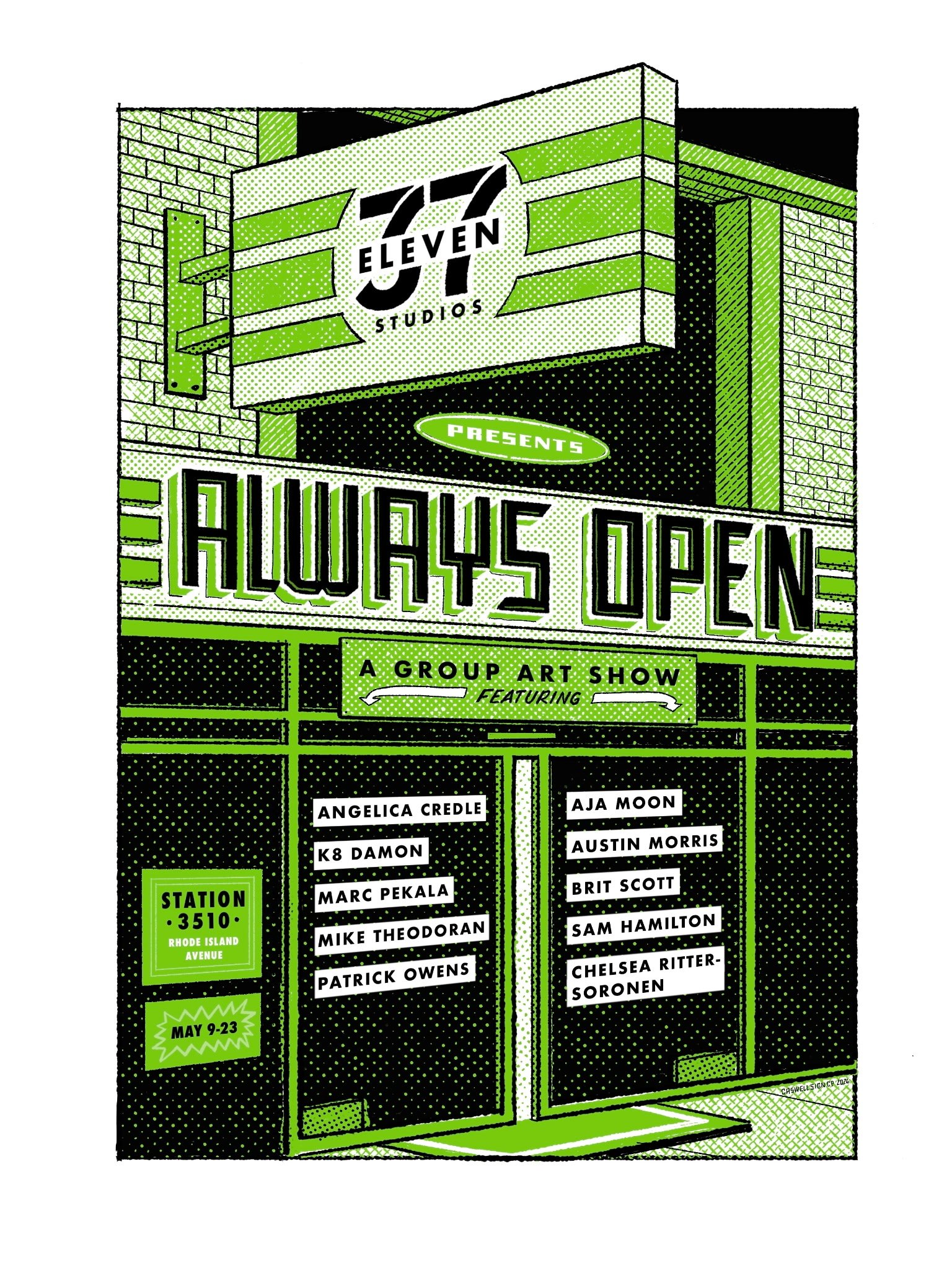 Always open is a group exhibition by ten artists working out of 3711 Studios, united by a single constraint: each artwork must incorporate the same shared color. Inspired by the studio’s playful branding and visual language, the exhibition treats color not as a limitation, but as a point of connection. Across painting, graphic design, and mixed media, one hue becomes a vibrant study in individuality within community. Like a convenience store that never truly closes, 3711 Studios is shaped by artists working at all hours. Some arriving early, others late, making the studio a constantly open site of exchange and creation.